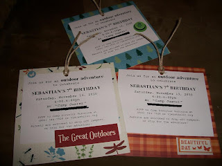 For the invitations, I bought a $5 scrapbook packet at Walmart (outdoor theme). I also bought a $5 spool of twine. The leftover twine was used to tie a compass around each gift bag (filled with plastic bugs, smore kits, and candy), and to hang forest/tree decorations from the ceiling,